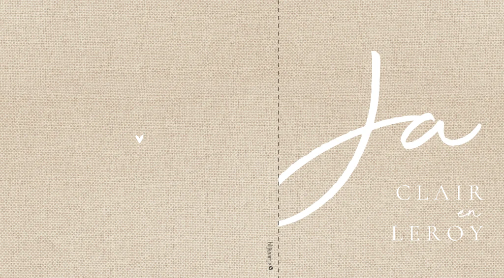 Stijlvolle trouwkaart met beige linnenlook achtergrond. In witte letters staat groot 'Ja'. De namen van het bruidspaar worden gedrukt in mat goudfolie. Bijzonder aan deze kaart is dat de voorzijde verkort is waardoor je de buitenrand van de binnenzijde van de kaart ziet. Zet hier jullie trouwdatum neer.