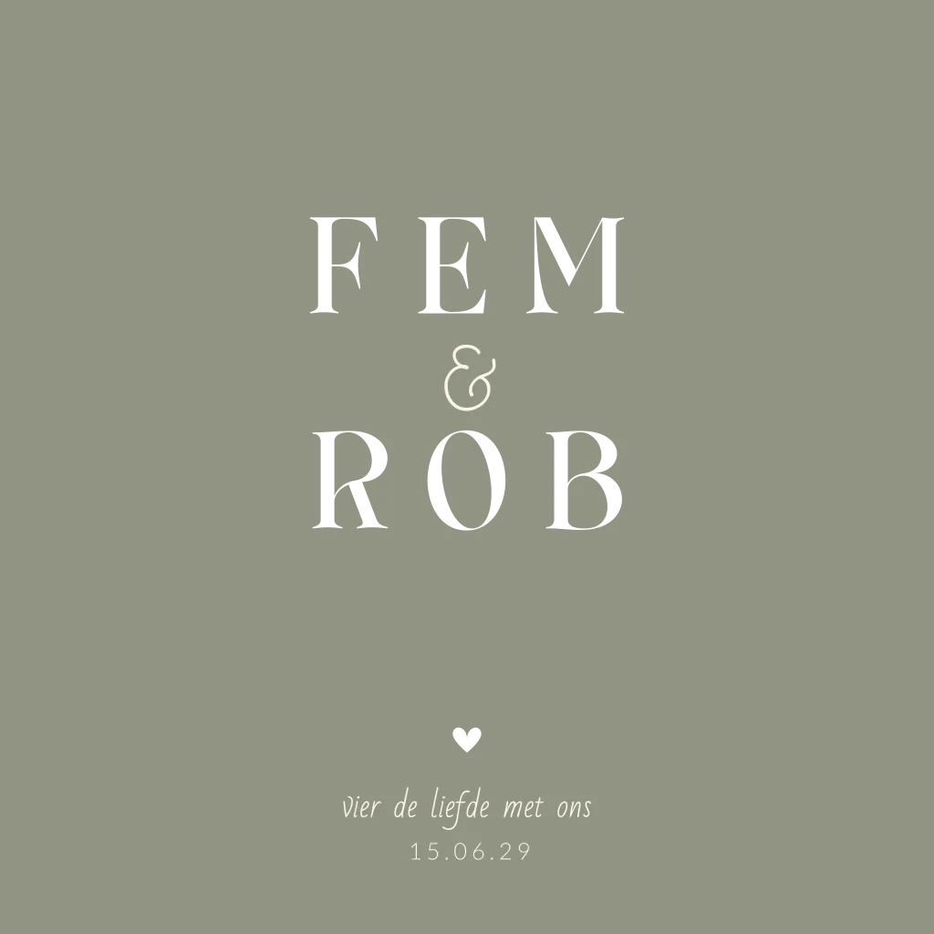 Rustige en stijlvolle trouwkaart met een mooie groene achtergrondkleur. Centraal staan de namen van het bruidspaar in luxe goudfolie. Foliedruk trouwkaarten zijn een echte eyecatcher en staan garant voor een unieke uitstraling. Pas de teksten, kleuren en lettertypes naar je eigen smaak aan in de editor. Bestel van te voren een proefdruk zodat je het kaartje in het echt kan bewonderen.