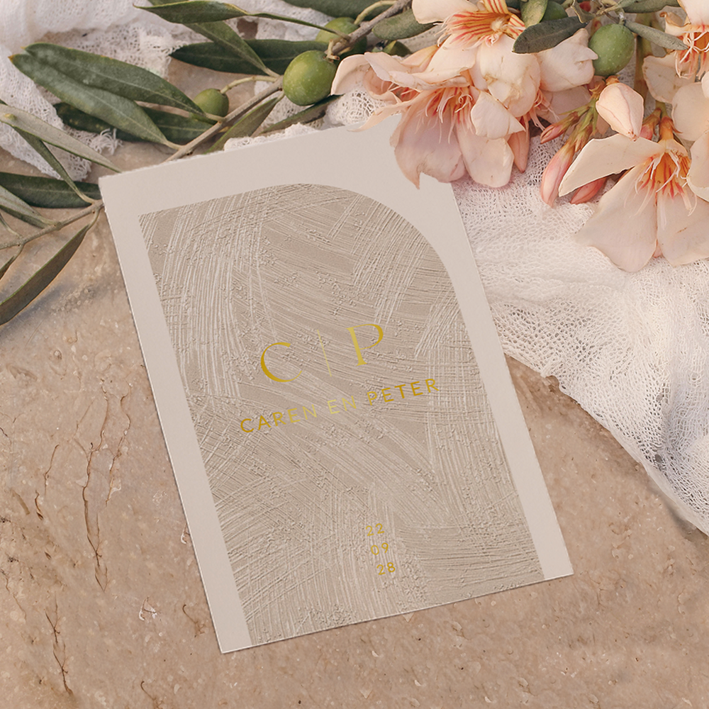 Stijlvolle strakke trouwkaart met trendy kleuren. Deze huwelijksuitnodiging heeft een stijlvol design met een half boogvormig kader met goud bronzen vegen en in goudfolie de initialen van het bruidspaar. De goudfolie geeft een luxe touch en heeft een mooie glans. Pas deze trouwkaart eenvoudig aan in de editor. Hulp nodig? Wij helpen je graag!