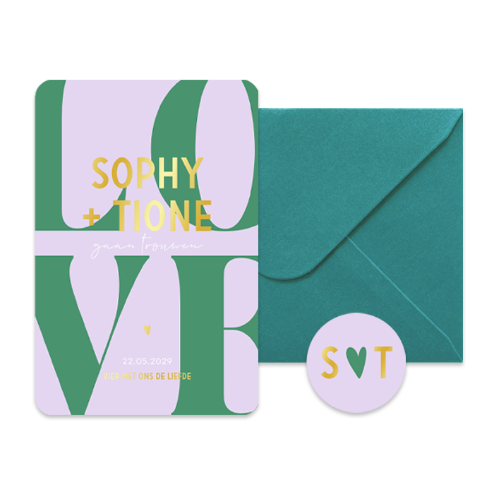 Op zoek naar een trendy trouwkaart met een vleugje exclusiviteit? Ontdek dan deze trouwkaart met foliedruk en de typografische tekst ´Love´. Deze hippe trouwkaart heeft speelse ronde hoeken, typografische letters en goudfolie. Het goudfolie zorgt voor een extra vleugje luxe. Ook de kleuren lila, groen en goud van deze trouwkaart spatten van de kaart af. Pas deze originele trouwkaart naar eigen wens aan in onze online editor en voeg de petrol envelopkleur en de bijpassende sluitzegel toe aan je bestelling.