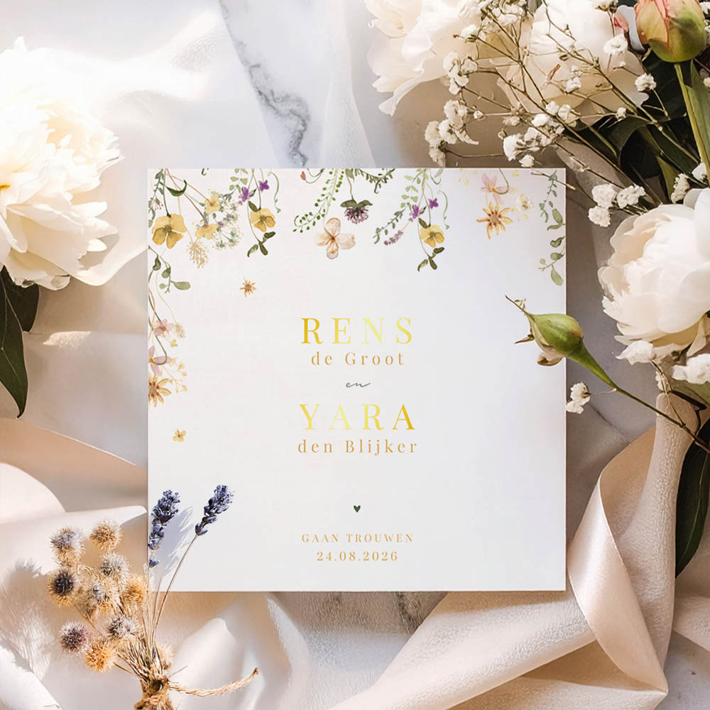 Stijlvolle vierkante trouwkaart met prachtige aquarel bloemen en een lichte linnen achtergrond. Dit kaartje past helemaal binnen de bloementrend van nu! De namen van het bruidspaar worden gedrukt in écht goudfolie. De folie heeft een mooie glans en geeft deze kaart een extra luxe uitstraling.