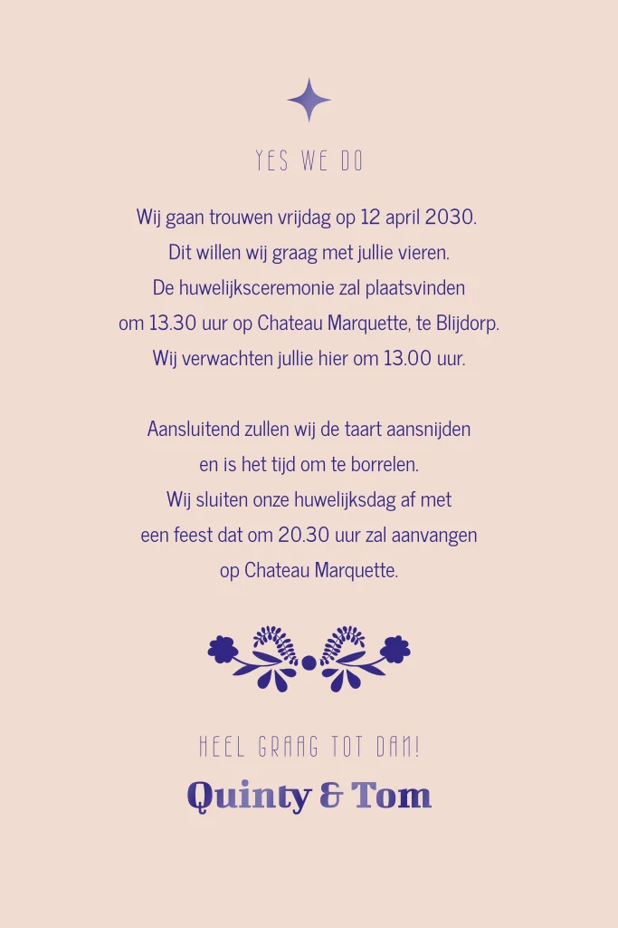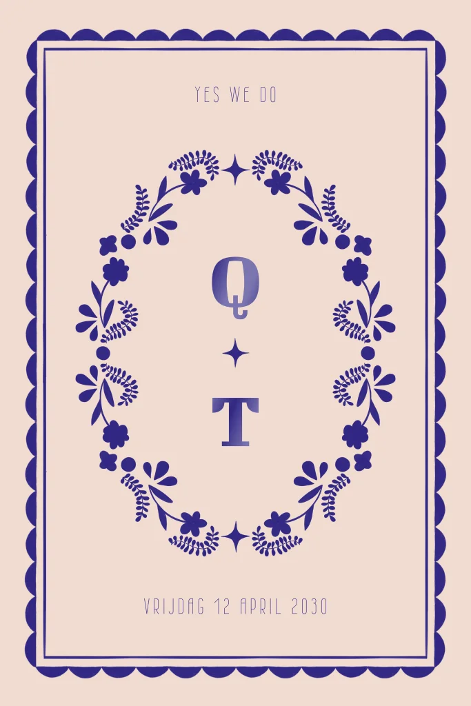 "Yes we do!" En laat dat al je gasten weten met deze trouwkaart. Deze huwelijksuitnodiging zal zeker opvallen met een bijzonder folk patroon van bloemenkrans en blauw kader. De initialen van het bruidspaar wordt gedrukt in opvallend hoogglans lak. De kleuren, teksten en lettertypes pas je eenvoudig aan in de editor. Hulp nodig? We helpen je graag.