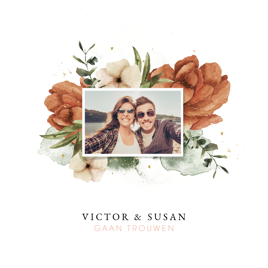 Huwelijksuitnodiging met eigen foto. Deze trouwkaart heeft een romantische uitstraling door de bloemen die erin zijn verwerkt. Achter de foto een aquarel in een zachte goudkleurige tint. In combinatie met de witte achtergrond een frisse en trendy kaart. Enkele goudkleurige hartjes maken de kaart af.