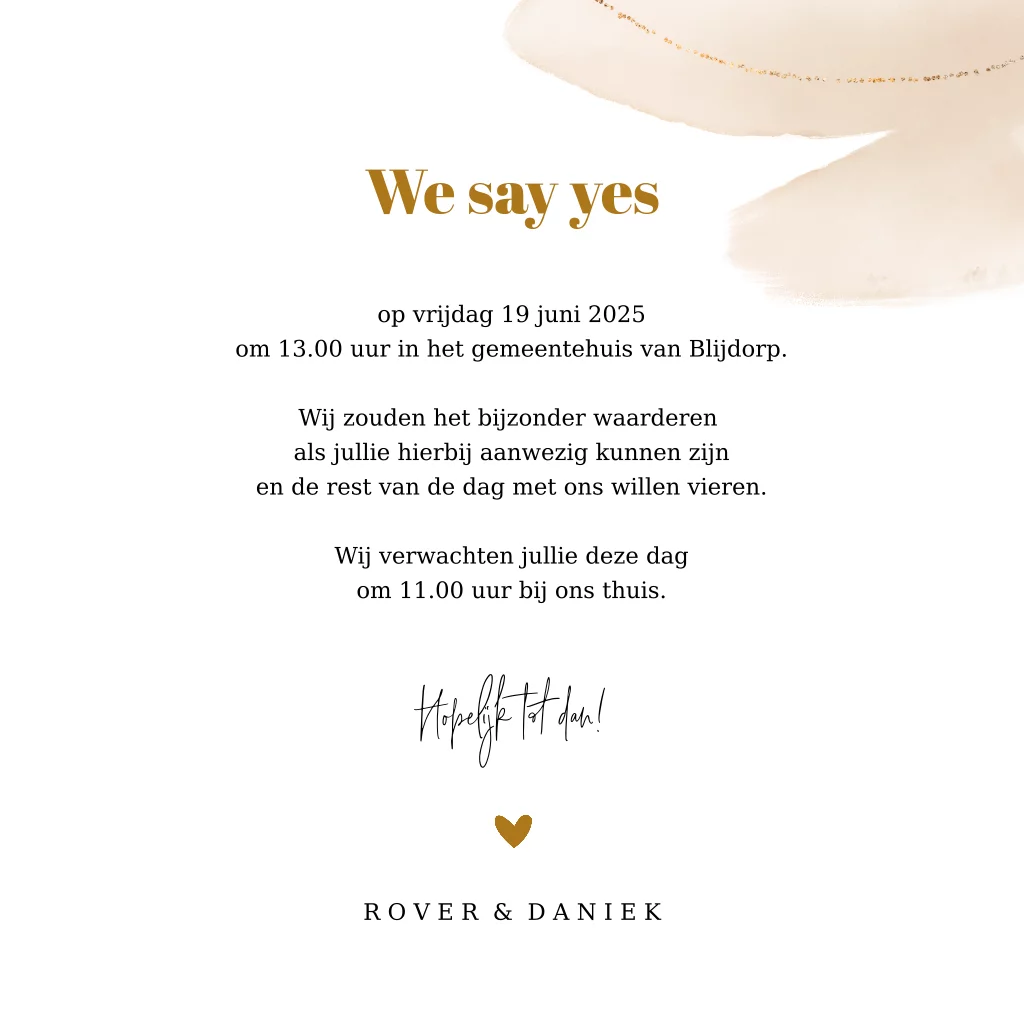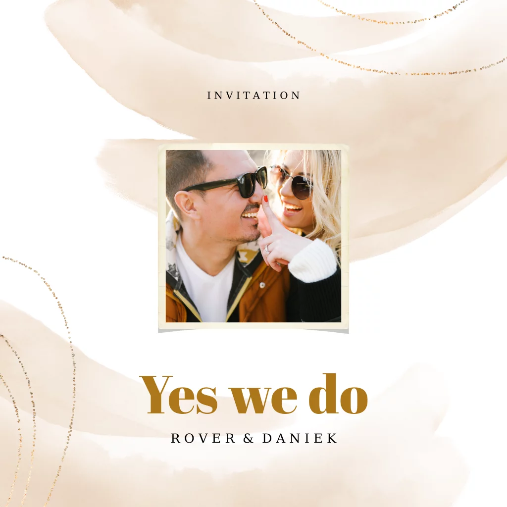 "Yes we do" trouwkaart. Deze huwelijksuitnodiging heeft warme, natuurlijke kleuren. De aquarel vegen in aardetinten in combinatie met de goudkleurige cirkels geven een sfeervol effect. Voeg jullie eigen mooie foto toe. En pas de teksten en lettertypes naar wens aan in de editor.