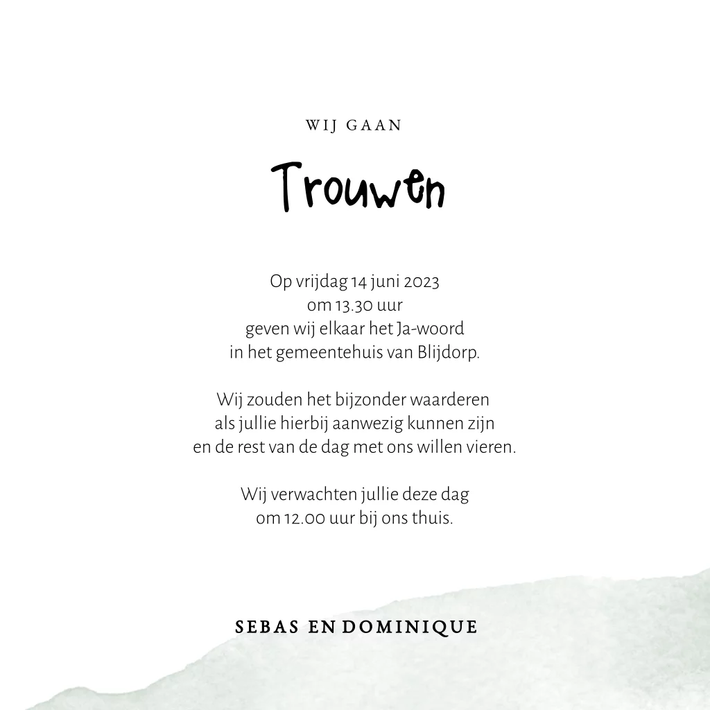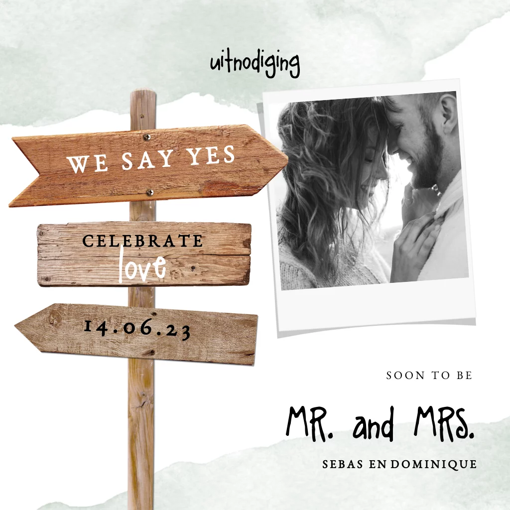 Foto trouwkaart voor de Mr and Mrs to be. Op deze huwelijksuitnodiging staat een houten paal met wegwijs bordjes. Op de achtergrond een groene aquarel. Teksten en lettertypes pas je aan in de editor.