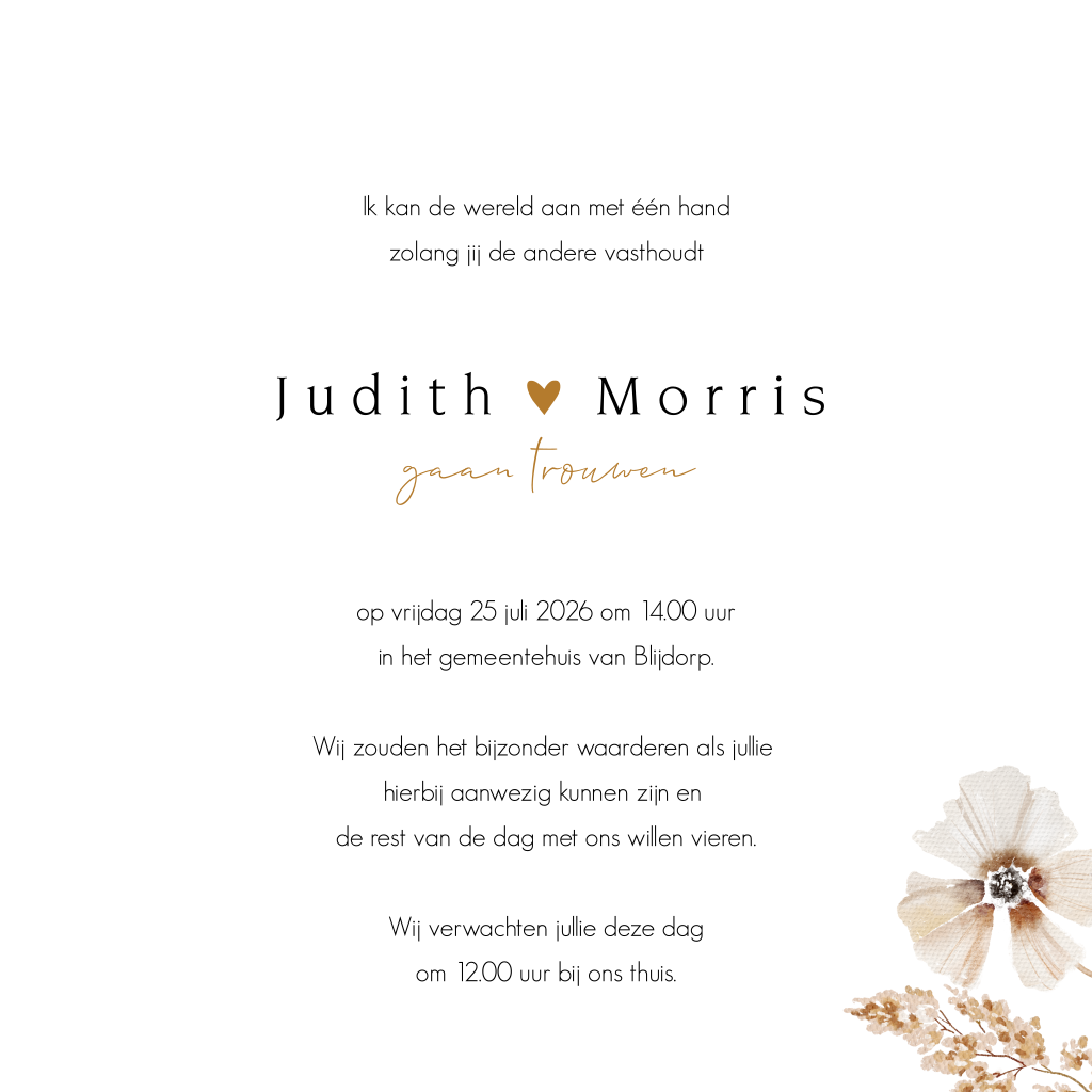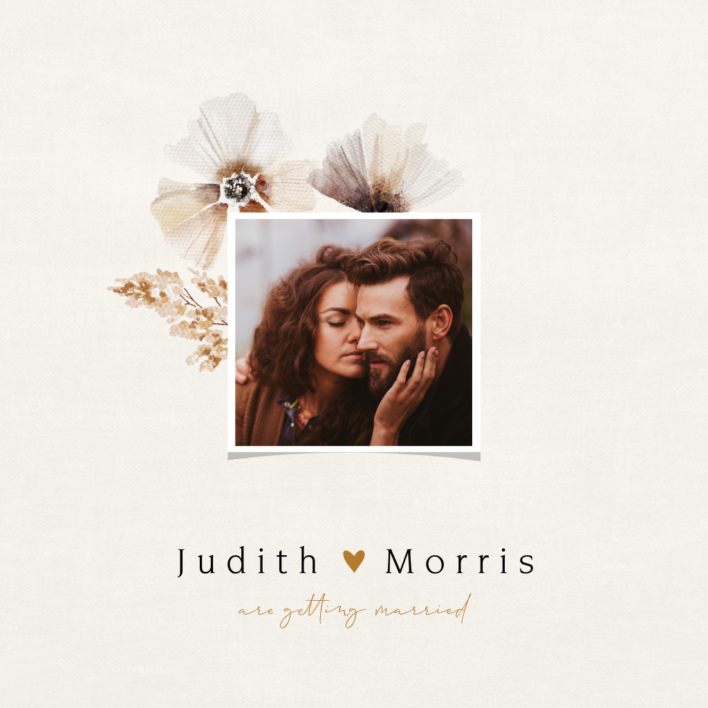 You are getting married! Laat dit al je gasten weten met deze stijlvolle uitnodiging voor jullie huwelijk, met aquarel bloemen en de achtergrond in trendy, beige linnenlook. Een romantische foto van jullie als stralend stel, mag natuurlijk niet ontbreken! Liever andere kleuren of lettertypes? Dit pas je eenvoudig aan in onze ontwerpmodule. Vragen of hulp nodig? We helpen je graag!