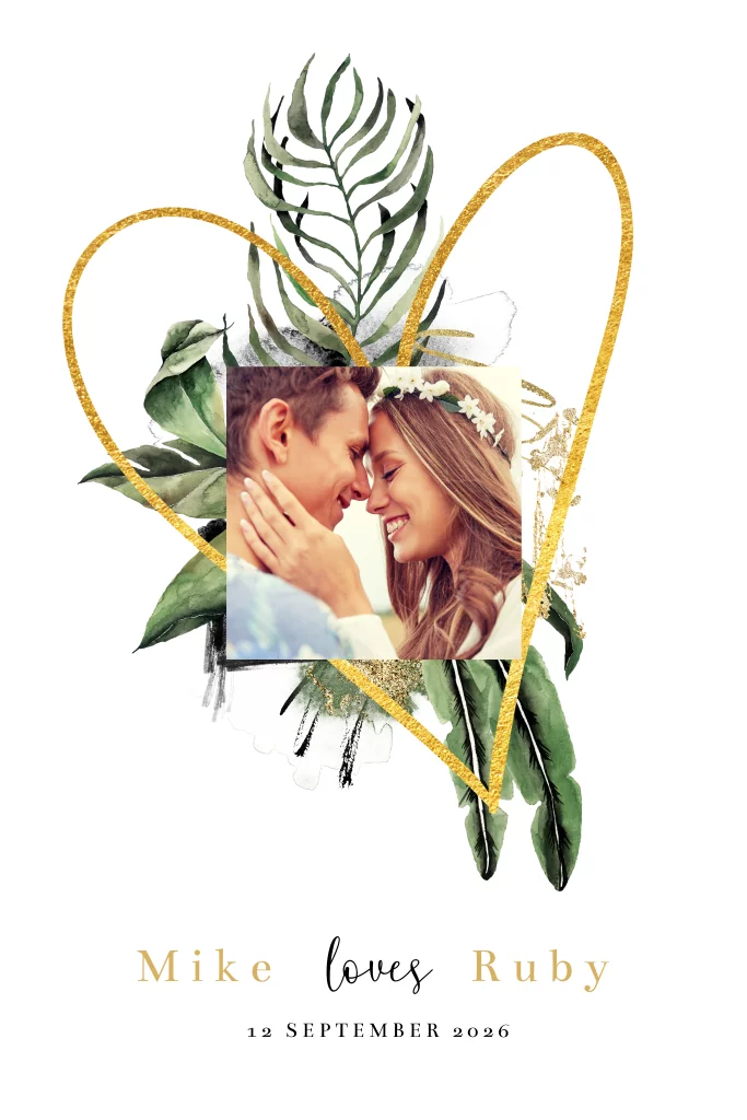 Hippe botanische trouwkaart met foto. Achter de foto staan mooie botanische bladeren en een goudkleurig hart. Pas de teksten en lettertypes naar wens aan in de editor.