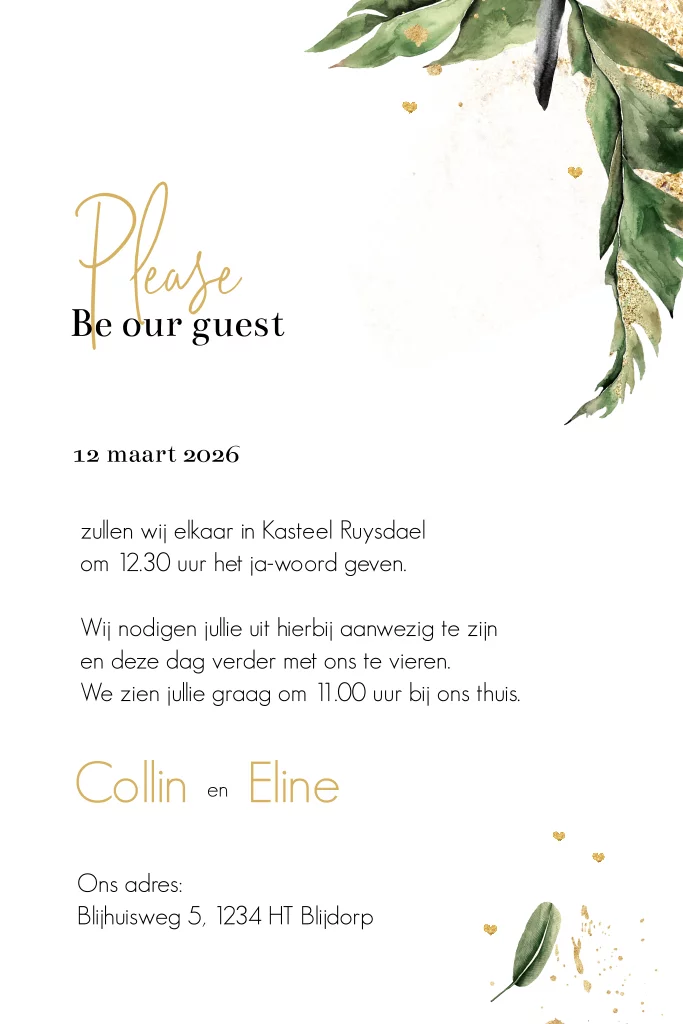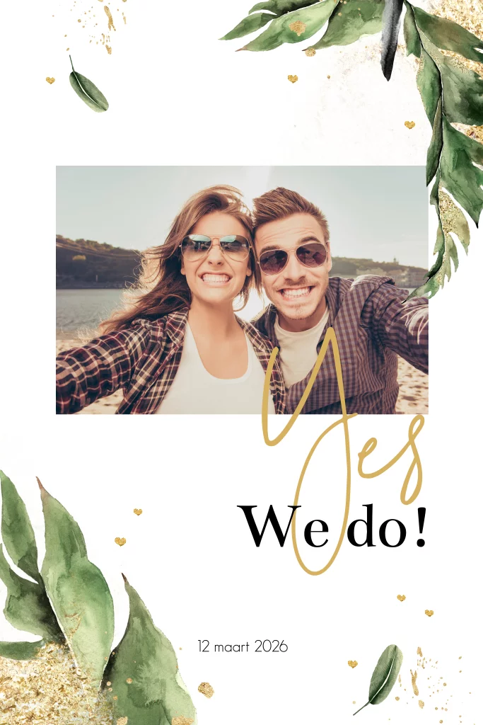 Hippe botanische trouwkaart met foto en de tekst "Yes we do". Op deze huwelijksuitnodiging staan verschillende botanische bladeren en kleine goudkleurige accenten, waaronder gouden spetters en kleine hartjes. Teksten en kleuren zijn naar wens aan te passen in de editor.