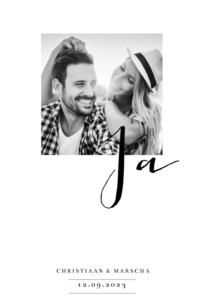 Hippe trouwkaart in zwart wit met foto. Deze kaart is clean, rustig en eenvoudig aan te passen naar jullie eigen wensen.