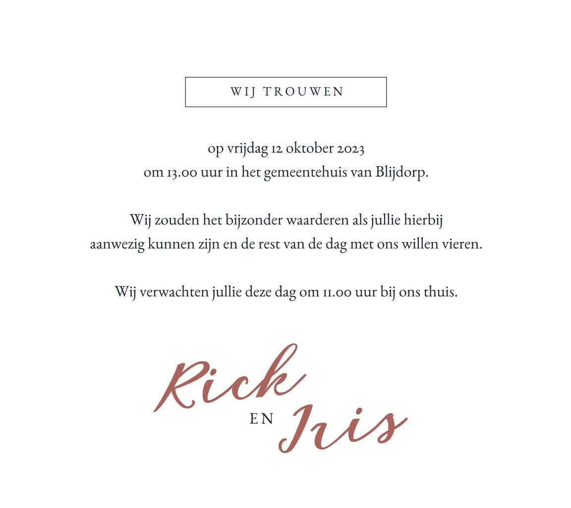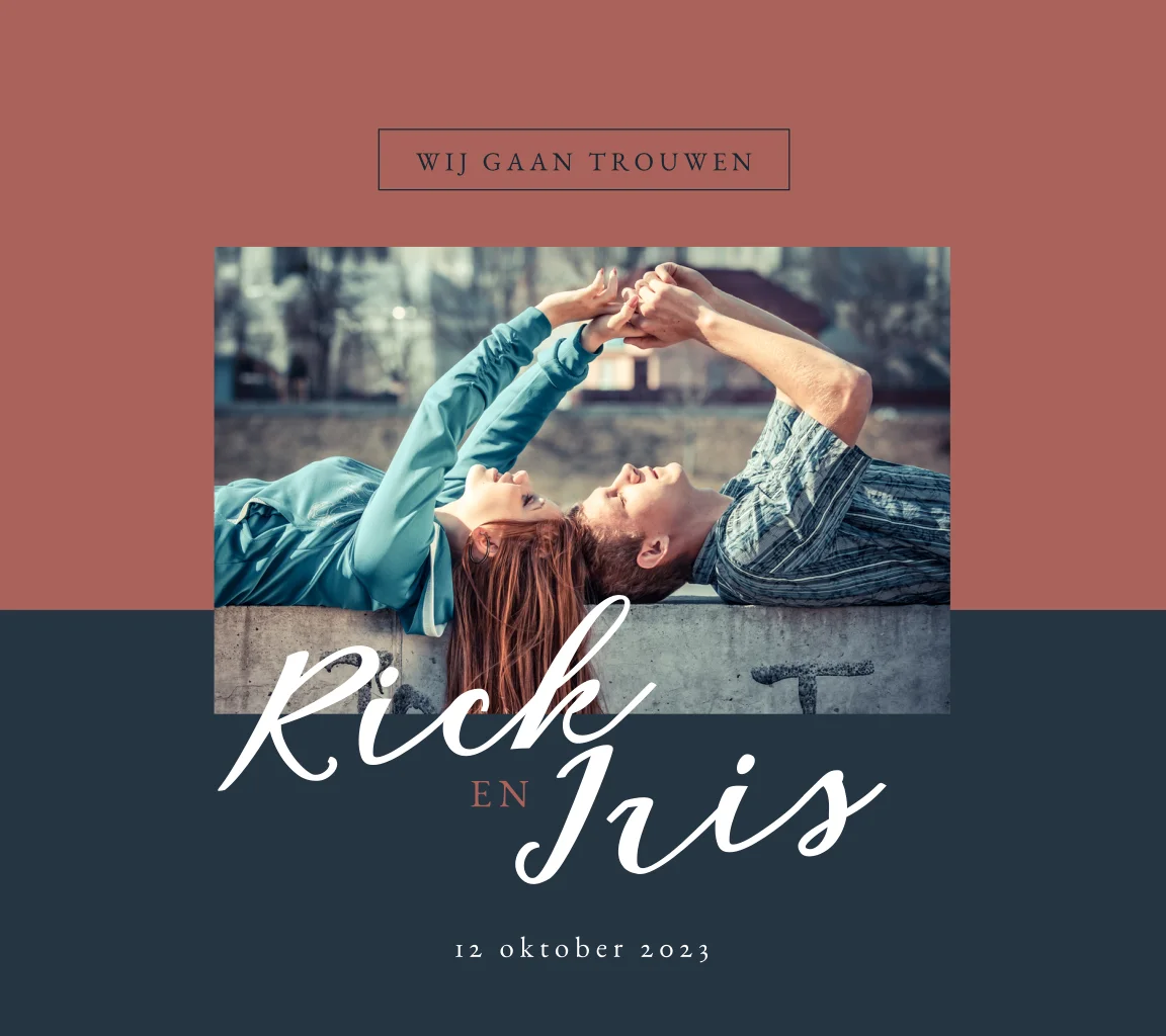 Hippe trouwkaart met 2 vlakken in trendy kleuren. De namen van het bruidspaar staan geschreven in een sierlijk lettertype. Voeg je eigen foto toe. De kleuren en teksten van deze huwelijksuitnodiging zijn gemakkelijk aan te passen.