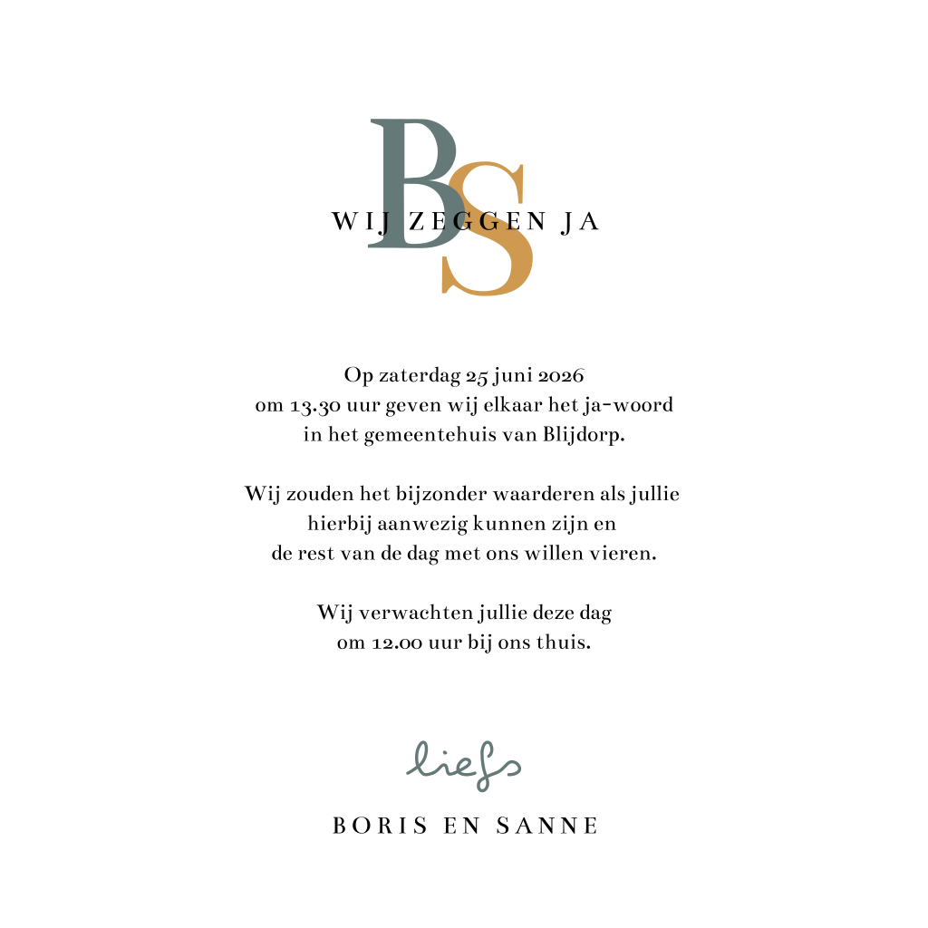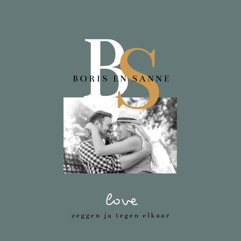 Moderne uitnodiging voor een huwelijk in de trendy kleur dauw. Op deze trouwkaart, met een modern en strak design, kun je een mooie persoonlijke foto toevoegen. Boven de foto staan de initialen en de namen van het bruidspaar. Pas de kleuren en lettertypes naar je eigen smaak aan in de editor en combineer met een mooie envelop om het helemaal af te maken.