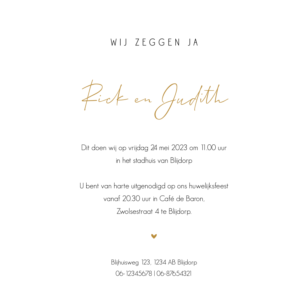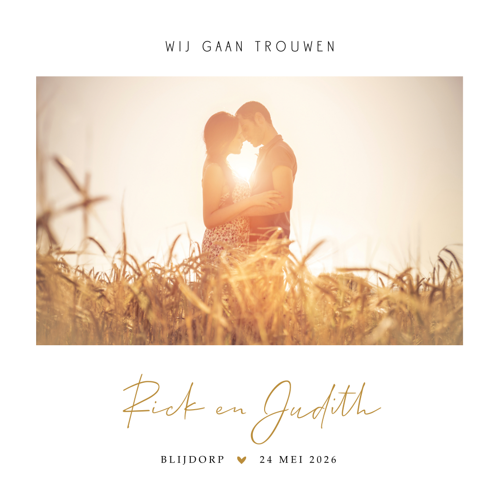 Rustige foto trouwkaart met sierlijke goudkleurige letters en gouden hartje. Deze huwelijksuitnodiging is eenvoudig en rustig en daardoor stijlvol en tijdloos. Op de voorkant plaats je eenvoudig jullie eigen foto.