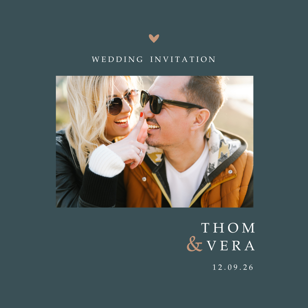 Moderne uitnodiging voor een huwelijk in de trendy kleur denim. Op deze trouwkaart, met een basic en strak design, kun je een mooie persoonlijke foto toevoegen. Pas de kleuren en lettertypes naar je eigen smaak aan in de editor en combineer met een mooie envelop om het helemaal af te maken.