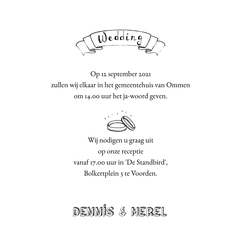 Vrolijke trouwkaart in zwart wit met eigen foto en een hartjes slinger. Er zijn op deze kaart doodle elementen gebruikt, oftewel grappige tekeningetjes van onder andere trouwringen en een banner.
