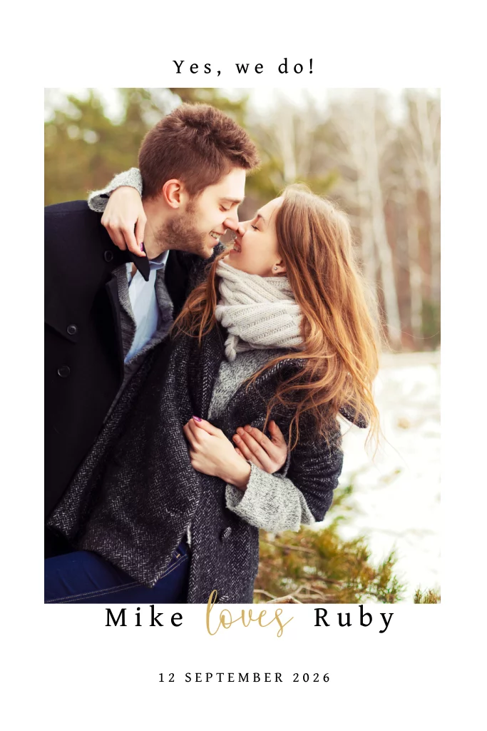 Hippe trouwkaart met op de voorzijde een mooie grote foto van het aanstaande bruidspaar. Boven de foto staat de tekst " Yes we do". Nodig de gasten uit voor jullie bruiloft met deze strakke huwelijksuitnodiging. Maak de kaart extra persoonlijk door de teksten en lettertypes naar jullie eigen smaak aan te passen.