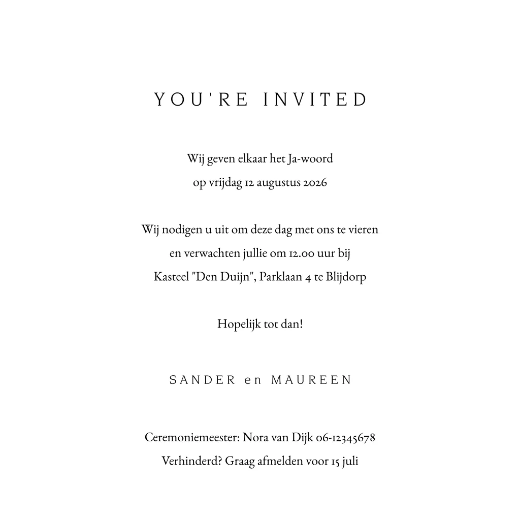 Cleane trouwkaart met Yes en daarachter een eigen foto. Maak van deze kaart je eigen unieke trouwkaart. Lukt het niet om je eigen foto hier mooi achter te plaatsen, dan helpen we je er graag bij!