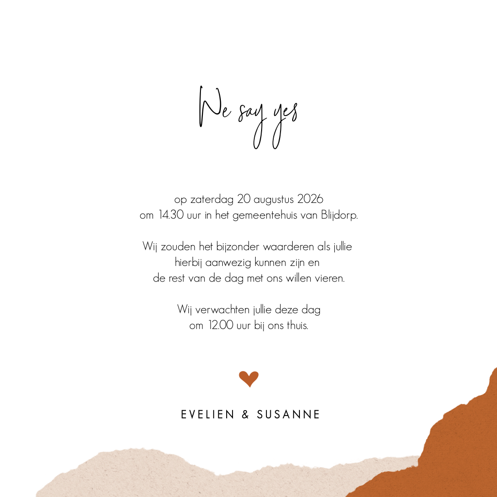 Op de achtergrond van deze huwelijksuitnodiging staan verschillende lagen karton in trendy kleuren, wat ook wel wat oogt als gescheurd papier. Onder de foto staan de namen van de bruiden in een sierlijk lettertype. Pas deze trouwkaart naar je eigen smaak aan in de editor en combineer met een mooie envelop om het helemaal af te maken.