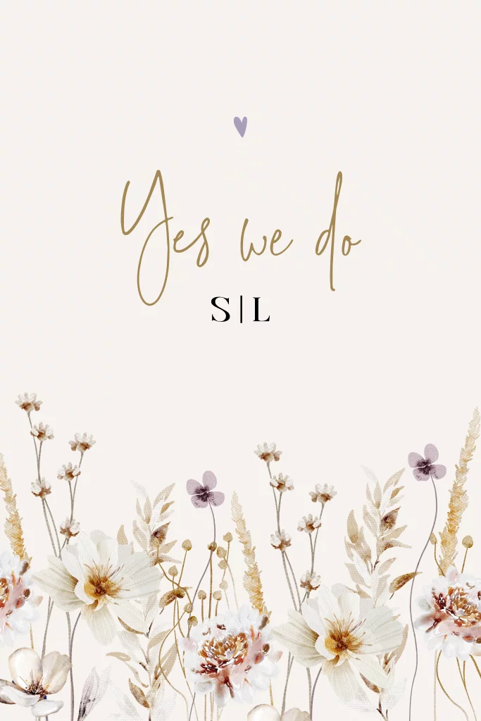 Prachtige trouwkaart met wildflowers. Deze huwelijksuitnodiging heeft een trendy beige achtergrond met onderaan een strook bloemen, helemaal volgens de laatste bloementrend! Maak af met een bijpassende envelop en sluitzegel. Pas de teksten, kleuren en lettertypes naar je eigen smaak aan in de editor. Ook kun je zelf bepalen of je ronde hoeken of foliedruk wilt.