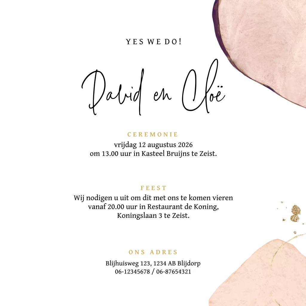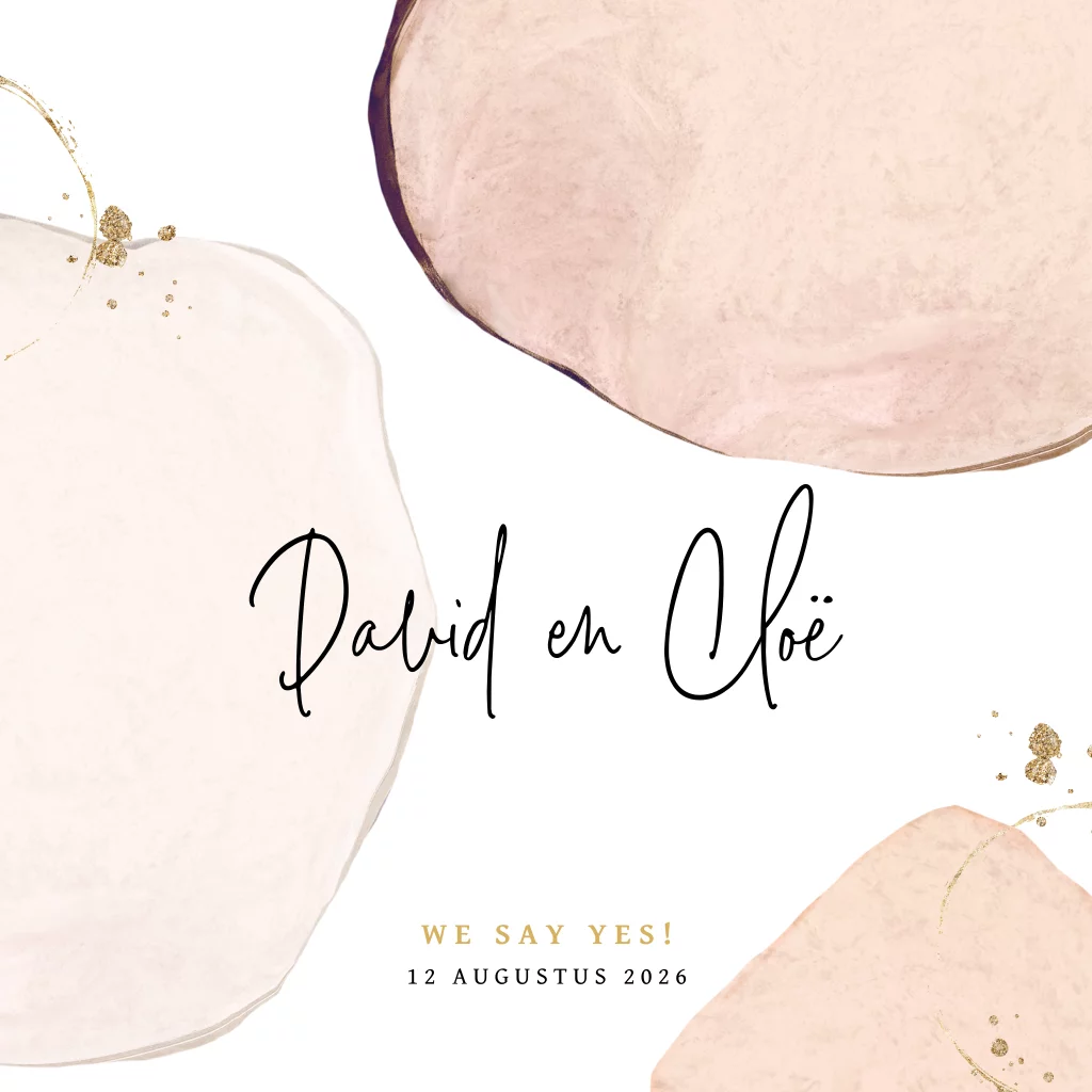 Hippe trouwkaart met mooie abstracte vormen in aquarel. Op deze uitnodiging staan de vormen in zachte roze tinten en maken de kleine gouden accenten het kaartje helemaal af.