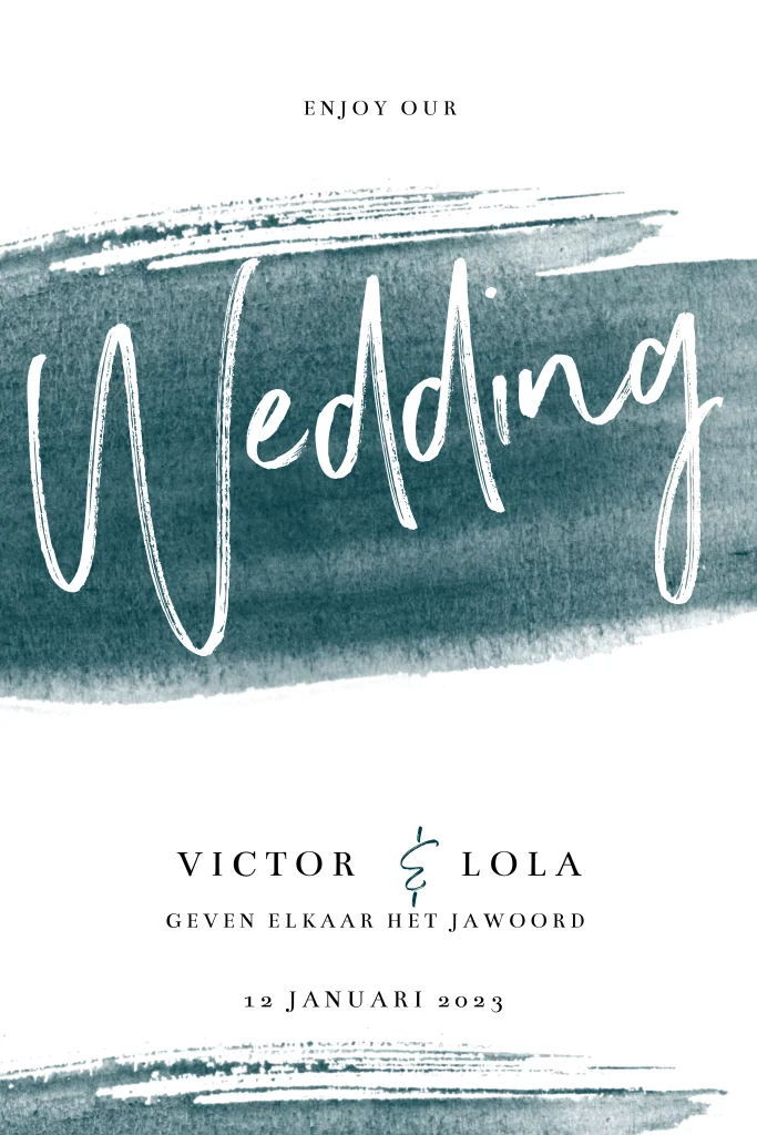 Enjoy our Wedding! Nodig je gasten uit voor jullie huwelijk met deze hippe trouwkaart in wit met donkergroene aquarel vegen. Teksten en kleuren zijn aan te passen in de editor.
