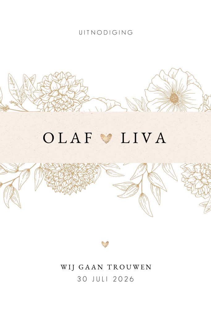 Een moderne trouwkaart met getekende bloemen. De namen van het bruidspaar komen in het gekleurde vlak mooi naar voren. Subtiele goudkleurige hartjes maken de kaart af. De tekst en kleuren van deze kaart zijn gemakkelijk aan te passen.
