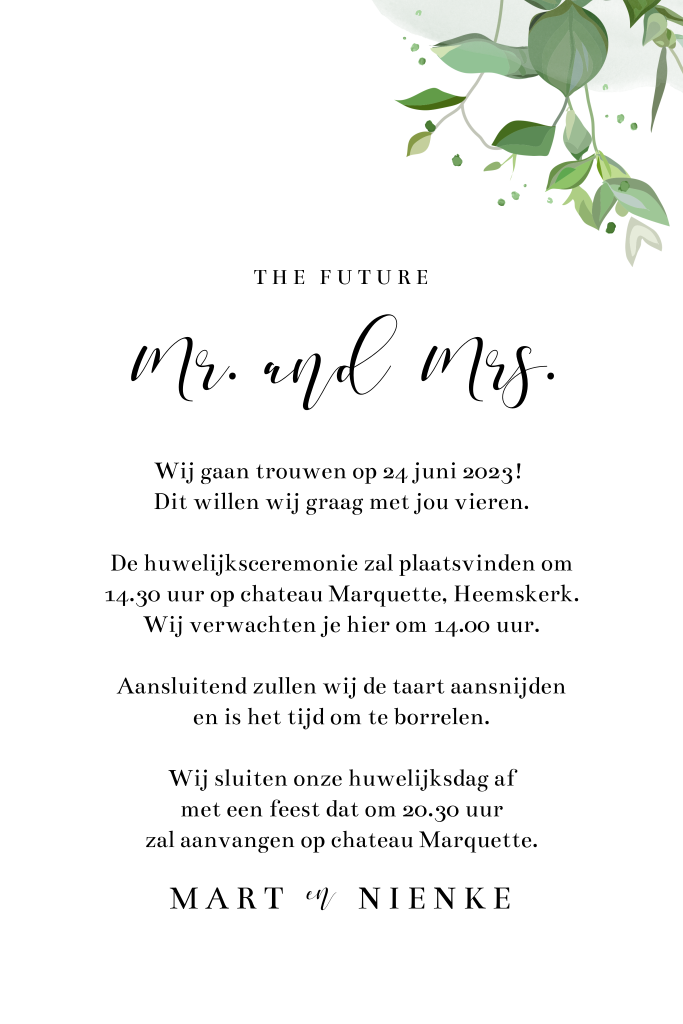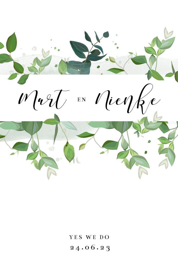 Hippe huwelijksuitnodiging met takjes met botanisch blad in verschillende groene kleuren. Subtiel op de achtergrond een groene aquarel. De namen van het bruidspaar staan in een sierlijke handwriting letter geschreven. De trouwkaart is overwegend wit en heeft daardoor een rustige uitstraling.