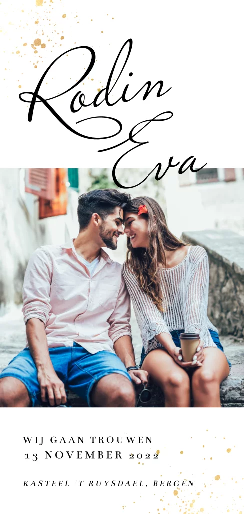 Mooie trouwkaart in een hip formaat. Op de voorkant van de kaar staat een eigen foto. De namen zijn geschreven in een sierlijk lettertype