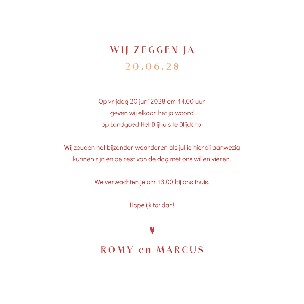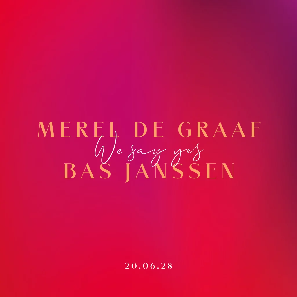 Met deze prachtige, hippe rode trouwkaart maak je een echte indruk op je gasten. Deze huwelijksuitnodiging heeft een mooi rood kleurverloop op de achtergrond en opvallende letters in de kleur oranje. Dit maakt de ´We say yes´ kaart extra opvallend en uniek. Pas de teksten, kleuren en lettertypes naar je eigen smaak aan in de editor voor jullie prachtige trouwkaart.