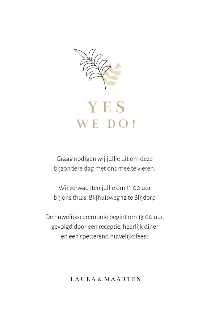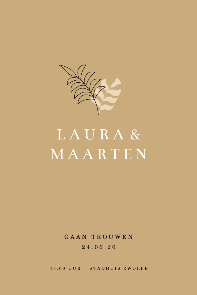 Hippe en stijlvolle trouwkaart met mooie takjes. De namen van het bruidspaar staan geschreven in een strak lettertype. De teksten zijn gemakkelijk aan te passen in de editor.