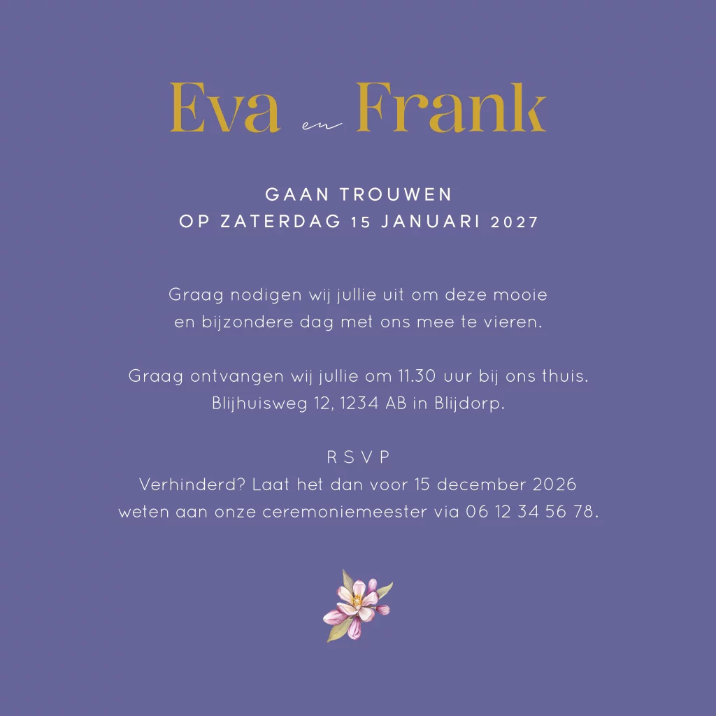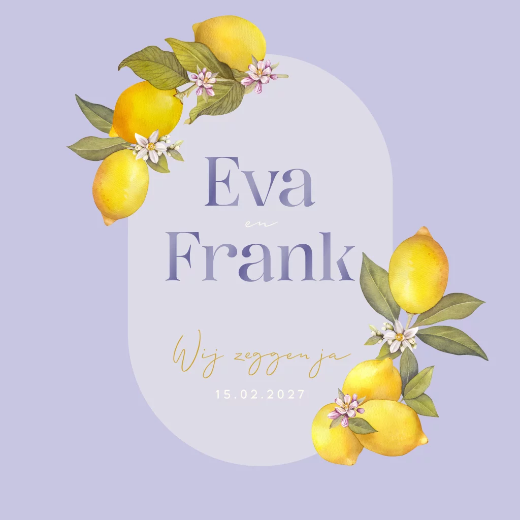 Een hippe, kleurrijke trouwkaart met een mooie combinatie van strakke en sierlijke letters voor een paarse achtergrond. Op deze trouwkaart een handgeschilderde illustratie van citroenen. De tekst wordt in hoogglans gedrukt, wat jullie trouwkaart een luxe, exclusieve uitstraling geeft. De kleur van de spot-uv lak is naar eigen wens aan te passen in onze editor.