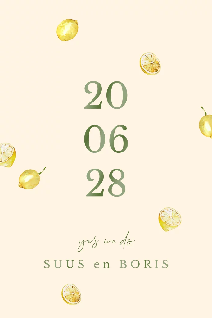 Hippe trouwkaart met fruit en afgeronde hoeken en datum. Deze huwelijksuitnodiging geeft een zomerse vibe door de lichte achtergrondkleur met een patroon van citroenen. Perfect voor een bruiloft in de zomer of in het buitenland! Extra speciaal aan deze trouwkaart is de hoogglans spot-uv lak. Dit geeft een speciale en luxe touch aan deze trendy uitnodiging voor een bruiloft.