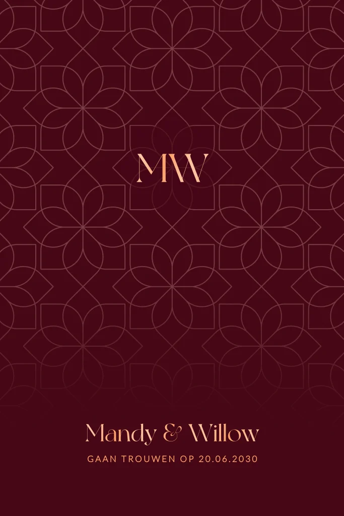 Trouwkaart met een art deco bloemen patroon en initialen van het bruidspaar. De hoogglans lak heeft een mooie glans. Pas de teksten, kleuren en lettertypes naar je eigen smaak aan in de editor. Bestel van te voren een proefdruk met een sample setje zodat je het kaartje in het echt kan bewonderen.