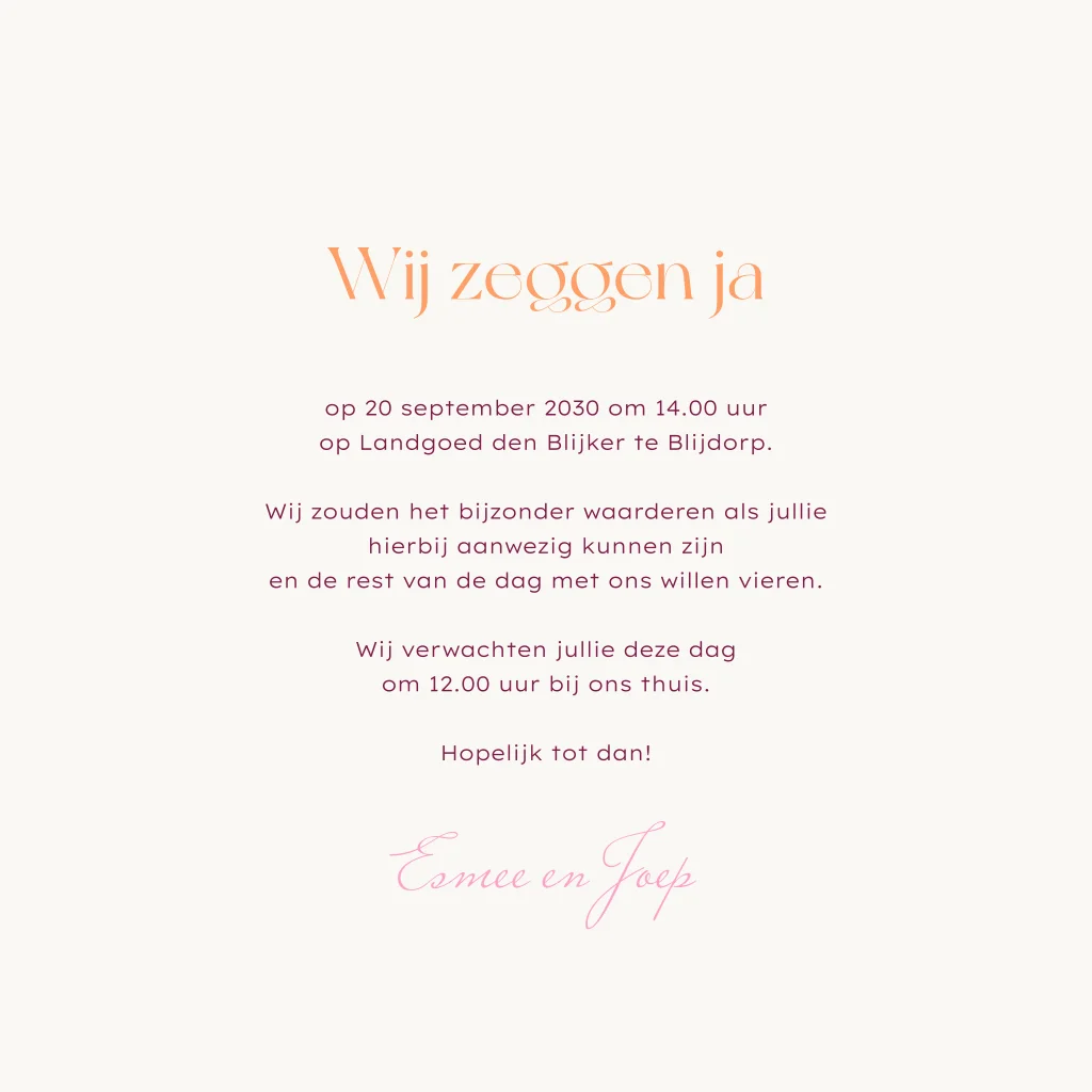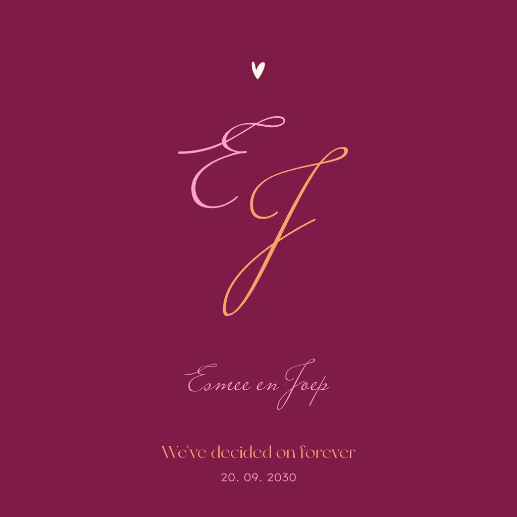 Hippe trouwkaart met een kleurrijk design. De initialen van het bruidspaar staan in sierlijke letters op de huwelijksuitnodiging. Pas deze kaart naar je eigen wensen aan.