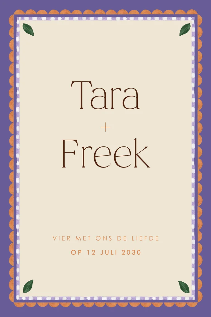Een kleurrijke boho eclectic trouwkaart voor jullie fantastische trouwdag! Maak indruk op jullie gasten met dit originele ontwerp, zodat jullie bruiloft niet onopgemerkt blijft. Deze trouwkaart heeft een kleurencombinatie van beige, paars en oranje met een speels eclectic kader van boogjes en blokken. Voeg jullie eigen namen en trouwdatum toe in de online editor en bestel vandaag nog de proefdruk.