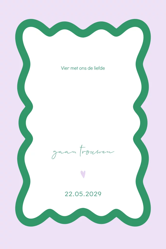 Kleurrijke trouwkaart met golvend kader en foliedruk. De kaart heeft pastel paarse met wit en groene kleuren. De goudfolie komt mooi naar voren op de kaart. Foliedruk trouwkaarten zijn een echte eyecatcher en staan garant voor een unieke uitstraling.