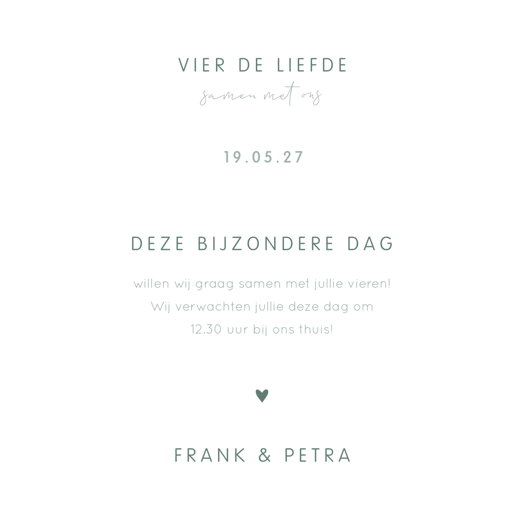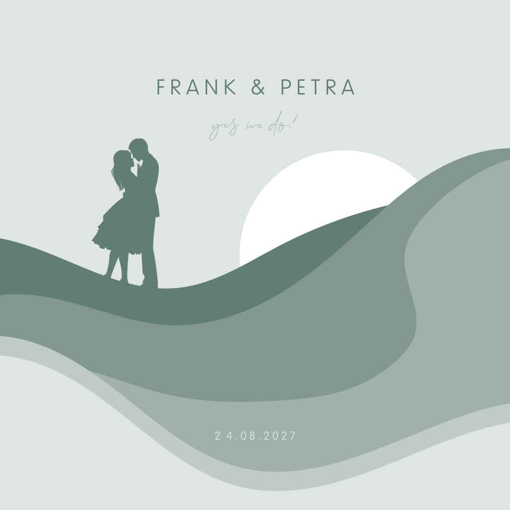 Moderne ton sur ton trouwkaart met prachtige groen blauwe kleurtinten. Op deze trouwkaart een silhouet van een verliefd koppel op een abstract berglandschap in organische vormen. Op de achtergrond een ondergaande zon. Teksten en kleuren zijn gemakkelijk aan te passen in onze editor. Hulp nodig? Wij helpen je graag verder.