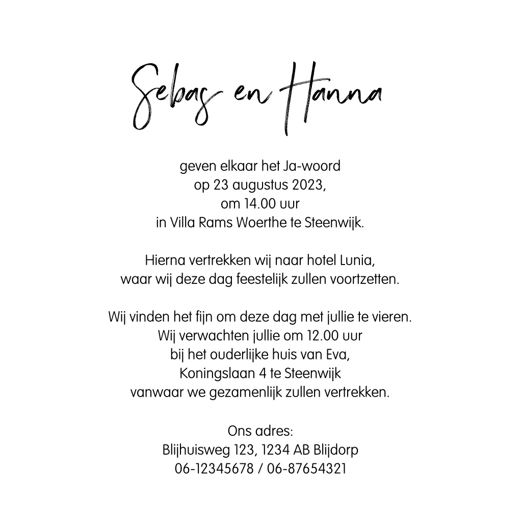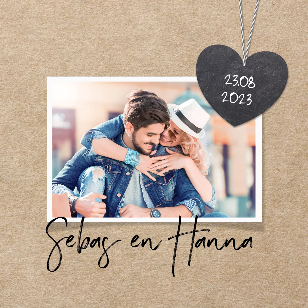 Speelse foto trouwkaart met een kartonnen achtergrond en een krijtbord hartjes label. Op de hartjes hanger staat de trouwdatum geschreven. Een eigen foto op de trouwkaart maakt deze huwelijksuitnodiging persoonlijk.
