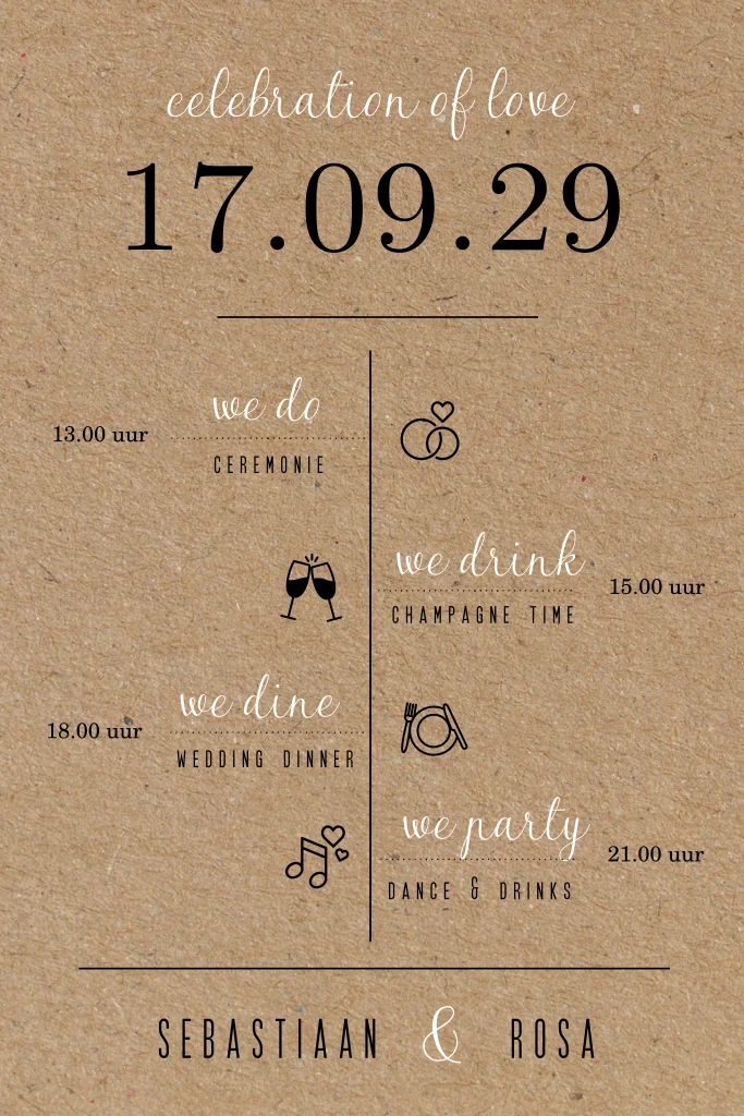 Typografische trouwkaart in zwart wit op een karton achtergrond. Op deze huwelijksuitnodiging staat een tijdlijn en symbolen om de indeling van jullie grote dag weer te geven. De teksten en icoontjes zijn aan te passen in de editor.