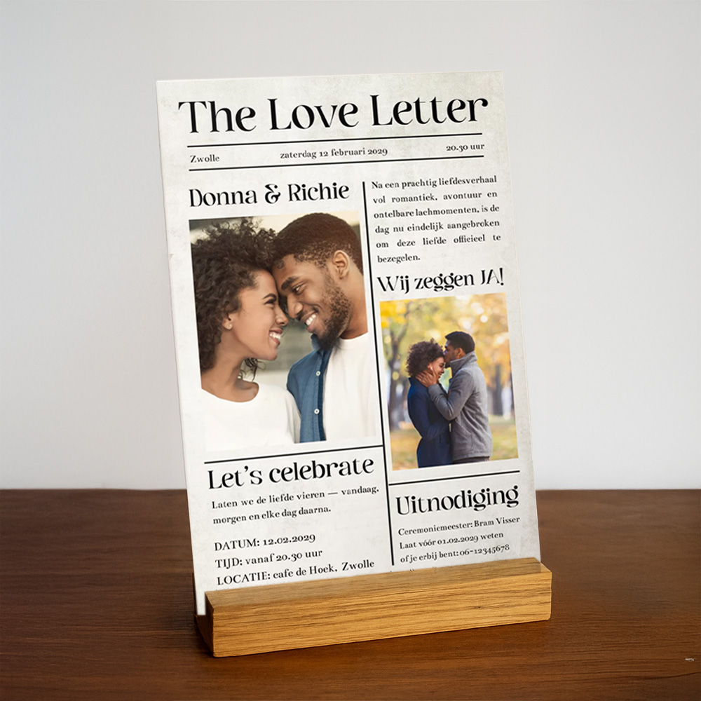Originele en grappige trouwuitnodiging in de stijl van een krant met de toepasselijke tekst 'The love letter'. Vier jullie bruiloft in stijl met deze toffe uitnodiging. De foto's geven een persoonlijke touch aan de uitnodiging. Vervang de foto's en pas de teksten eenvoudig aan in de editor.