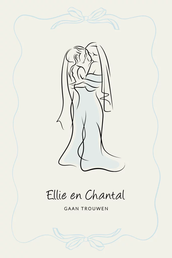 Trouwkaart met een lijntekening van twee vrouwen. Ze dragen beide een mooie trouwjurk. De kaart heeft een golvend kader met strik.