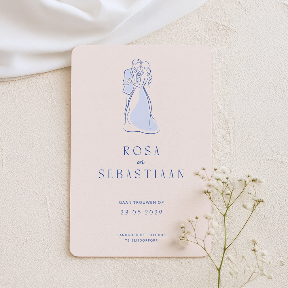 Rustige basic trouwkaart met een lijntekening van een bruidspaar in zachte blauwe tinten. Deze trouwuitnodiging heeft een zachte roze achtergrondkleur met een blauwe lijntekening en tekst. De ronde hoeken maken de uitnodiging helemaal af.