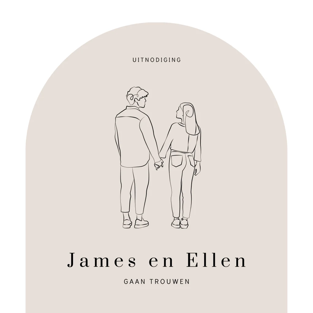 Een stijlvolle trouwkaart met een lijntekening van een koppel. De beige boogvorm zorgt voor een sfeervol geheel. Pas alles geheel naar eigen wens aan in de editor. Ook kunnen wij lijntekeningen op maat voor je maken. Neem gerust contact met ons op voor de mogelijkheden.