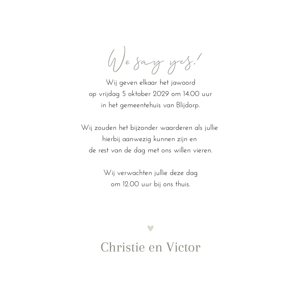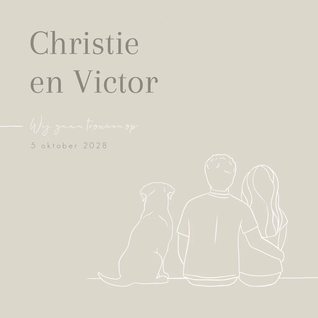 Een mooie trouwkaart met een lijntekening van een verliefd stel met hond. Deze huwelijksuitnodiging heeft neutrale kleurtinten en een basic design. Pas deze kaart naar je eigen smaak aan in de online editor en combineer deze kaart met een mooie zand envelopkleur om het helemaal af te maken. Een lijntekening op maat? Stuur ons gerust een berichtje!
