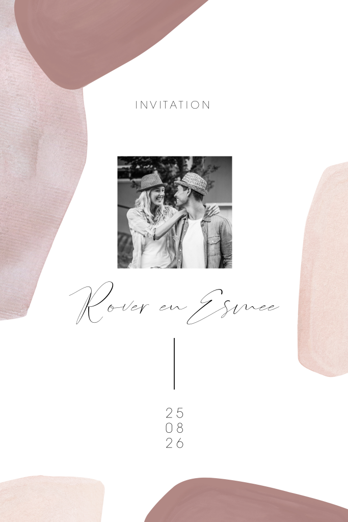 Mooie huwelijksuitnodiging met eigen foto en abstracte vormen in paars en roze tinten. Deze trouwkaart is onderdeel van onze trouwhuisstijl Lila Liefde, maar natuurlijk ook als separate kaart te gebruiken.
