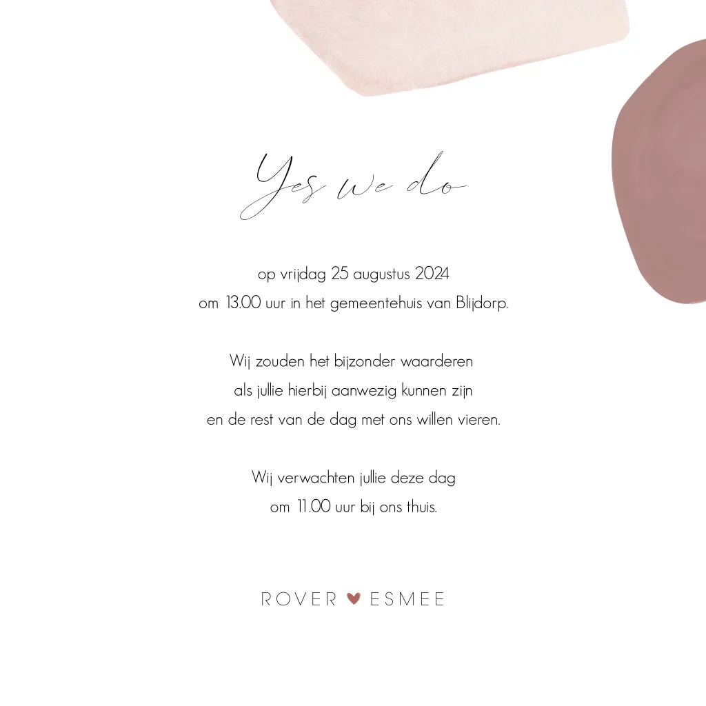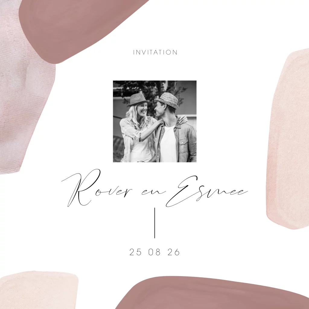 Nodig jullie gasten uit met deze cleane en chique foto trouwkaart. Deze uitnodiging is overwegend wit met abstracte vormen in paarse en roze tinten. Deze trouwkaart is onderdeel van onze trouwhuisstijl Lila Liefde.