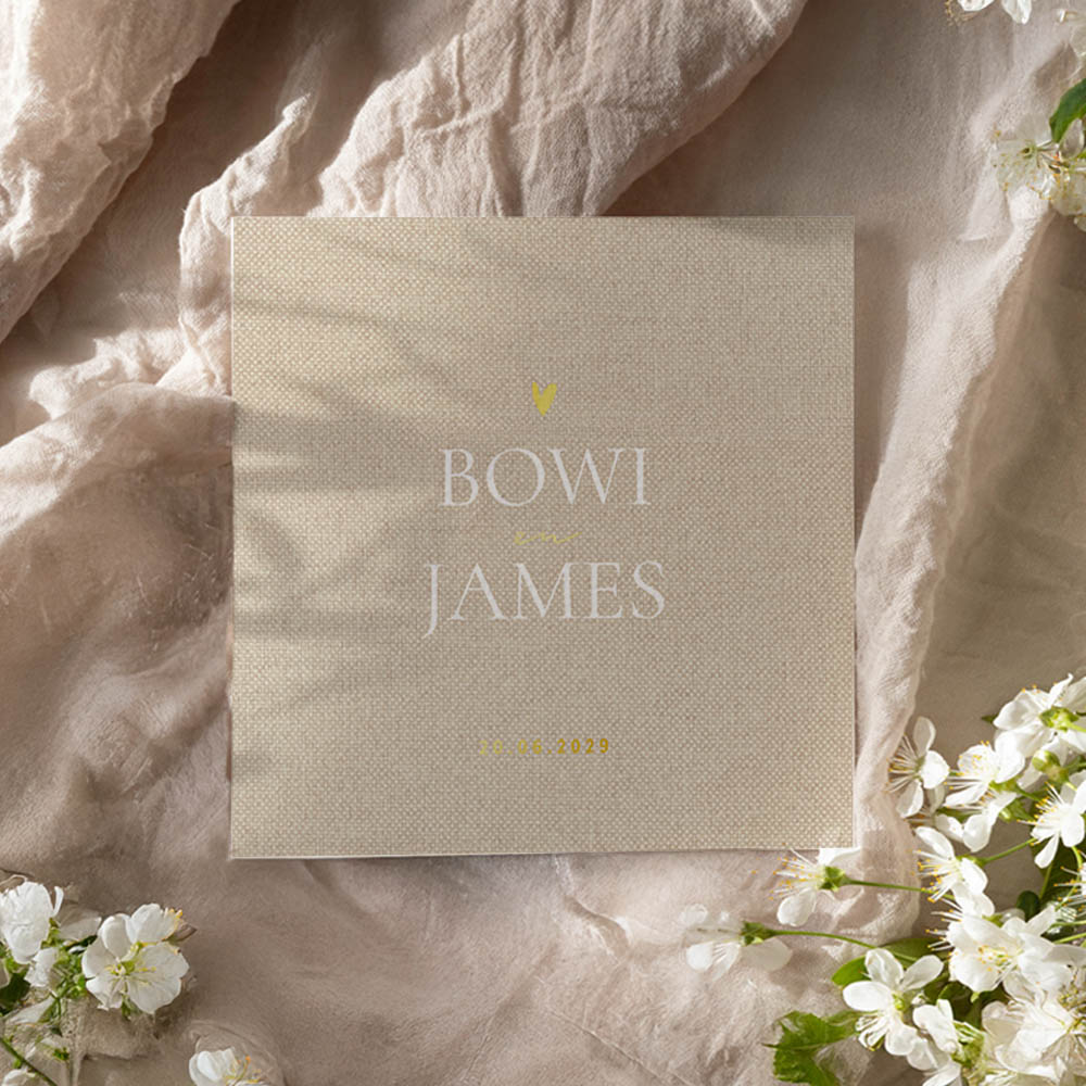 Basic trouwkaart in linnenlook met dubbelzijdig goudfolie. Deze trouwkaart heeft een bruin beige linnenlook waarop de witte letters en de goudfolie extra mooi naar voren komen. Maak het geheel af met een witte envelop met gouden inlay.