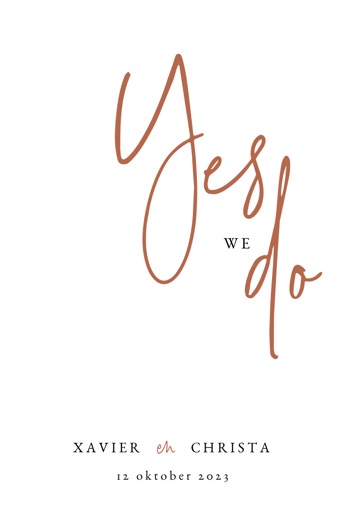 Deze huwelijksuitnodiging heeft een sierlijk en speels lettertype in de trendy kleur roestbruin. Verder is de kaart rustig en overwegend wit.