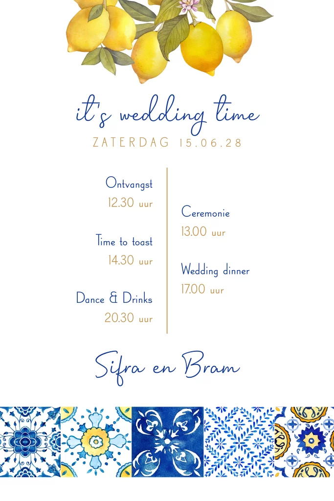 Een perfecte trouwkaart voor een bruiloft in de zomer! Deze kaart heeft een rustige uitstraling met een tijdlijn om de indeling van de dag weer te geven. Onderaan de trouwkaart zie je een strook mediterrane tegeltjes en bovenaan citrusvruchten, citroenen. Deze huwelijksuitnodiging is gemakkelijk te bewerken, opslaan en te bestellen. Wij helpen je graag met al je vragen of wensen.