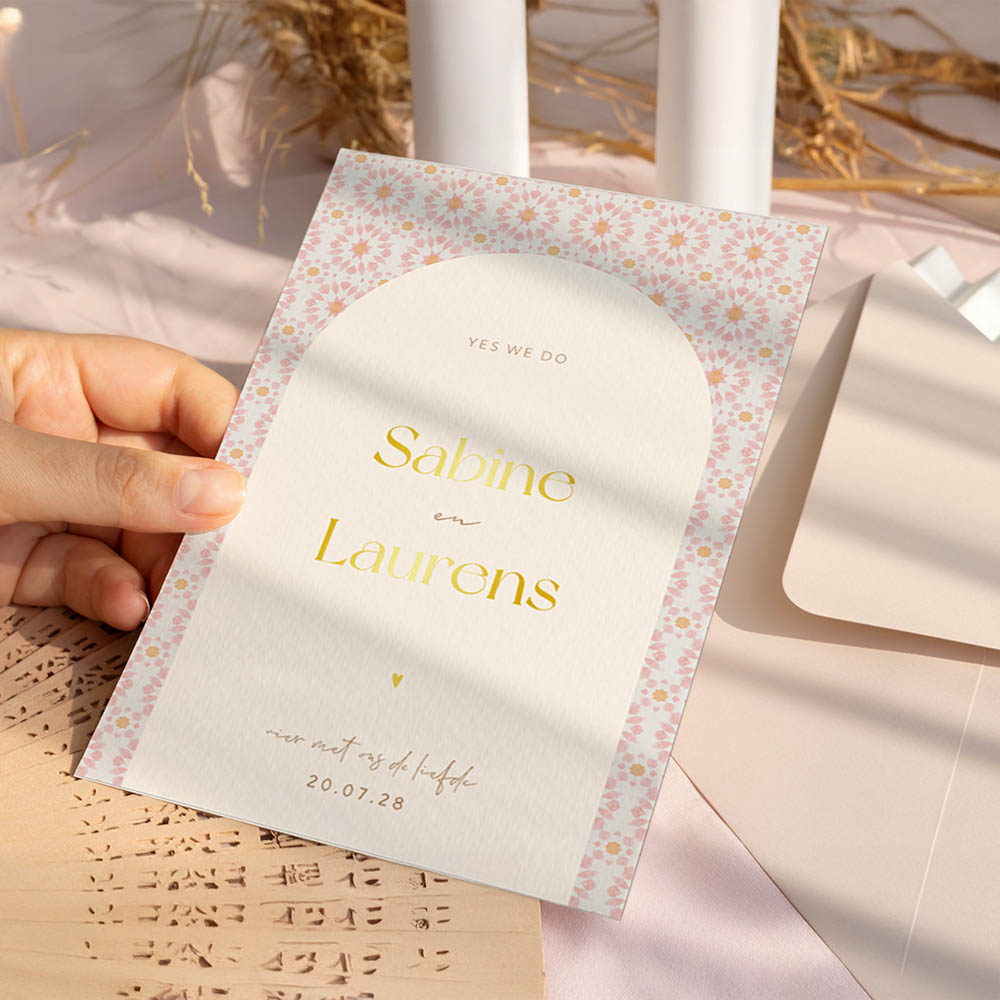 Luxe trouwkaart met roze mediterraans patroon met een kader met daarin de namen van het bruidspaar in goudfolie. Pas de teksten, lettertypes en kleuren eenvoudig aan in de editor. Hulp nodig bij het ontwerpen? Neem contact met ons op!