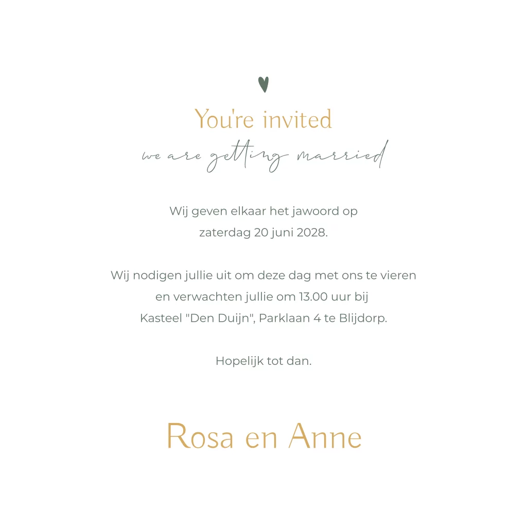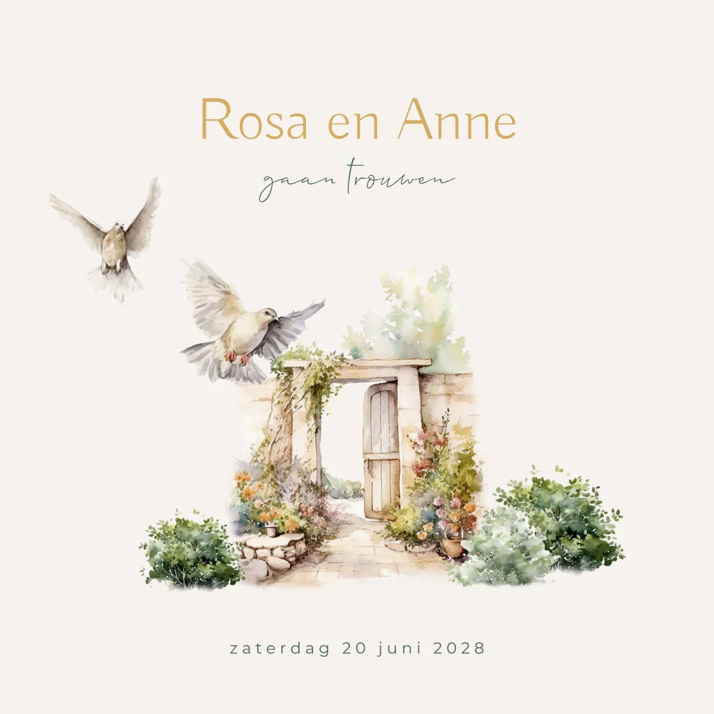 Deze prachtige trouwkaart is een mooie keuze voor een stel dat op zoek is naar een romantische uitnodiging met een vleugje mediterraanse charme. Met een aquarel tekening van een prachtige poort en twee vliegende duiven is deze kaart perfect voor een bruiloft met mediterraans thema of een bruiloft in het buitenland. Pas de kaart geheel naar eigen wens aan in de editor, zodat jullie trouwkaart precies aan jullie wensen voldoet.